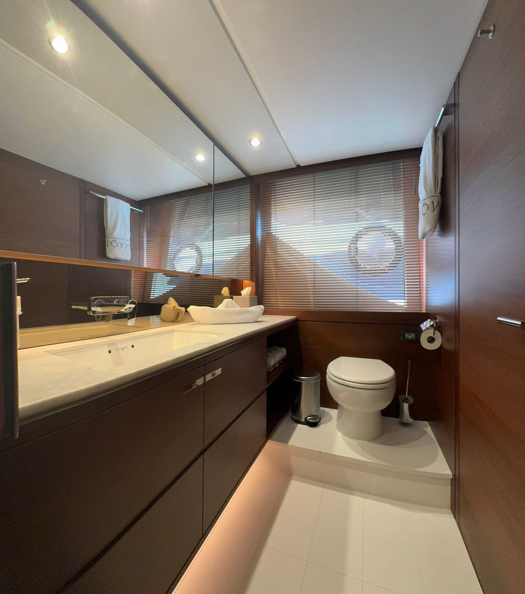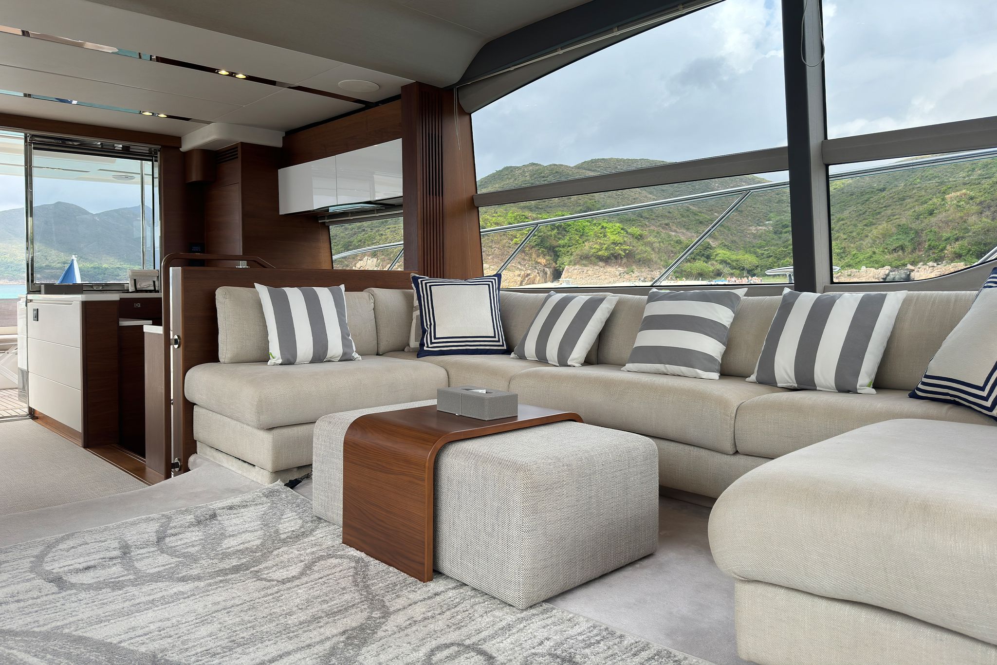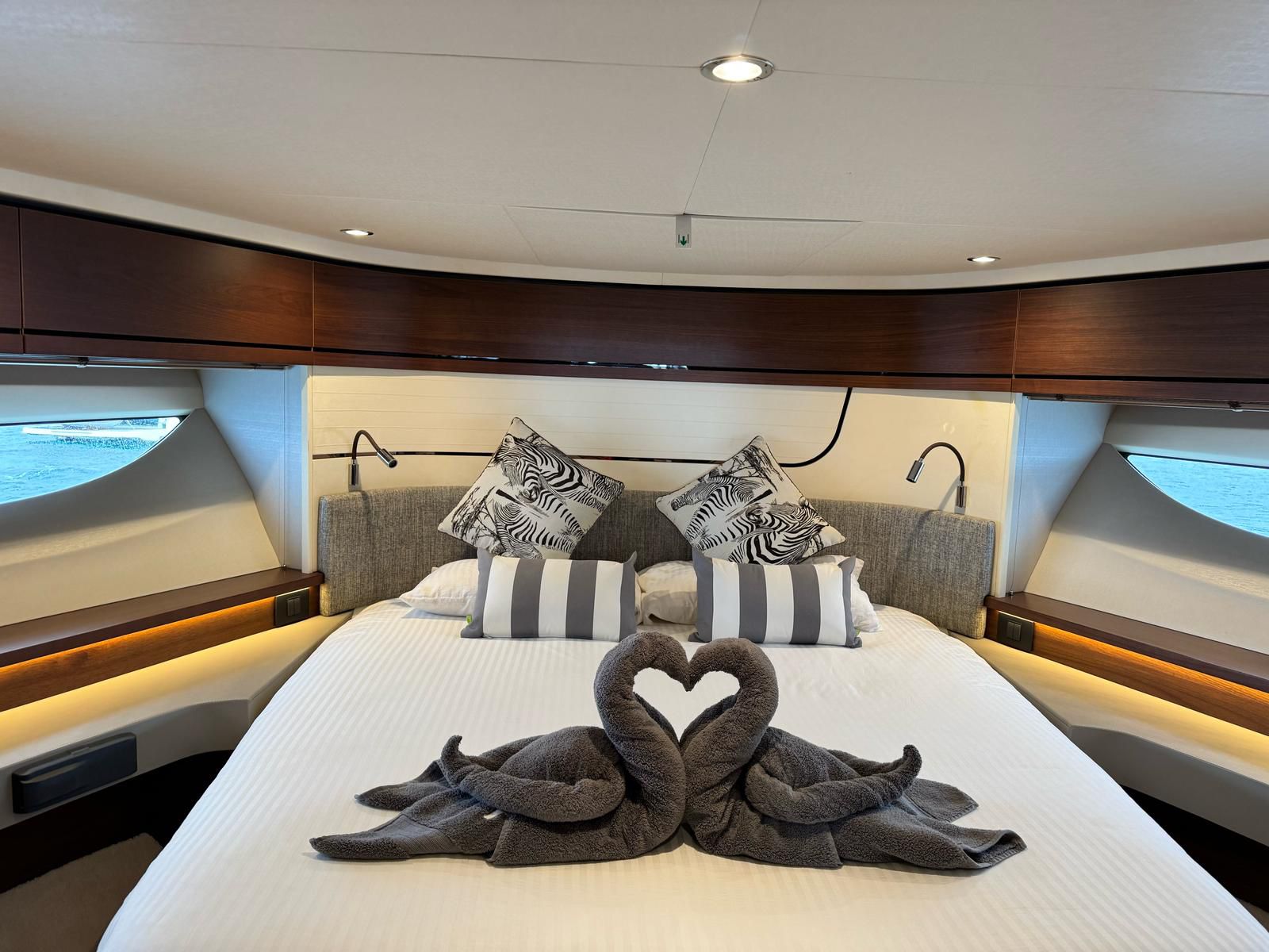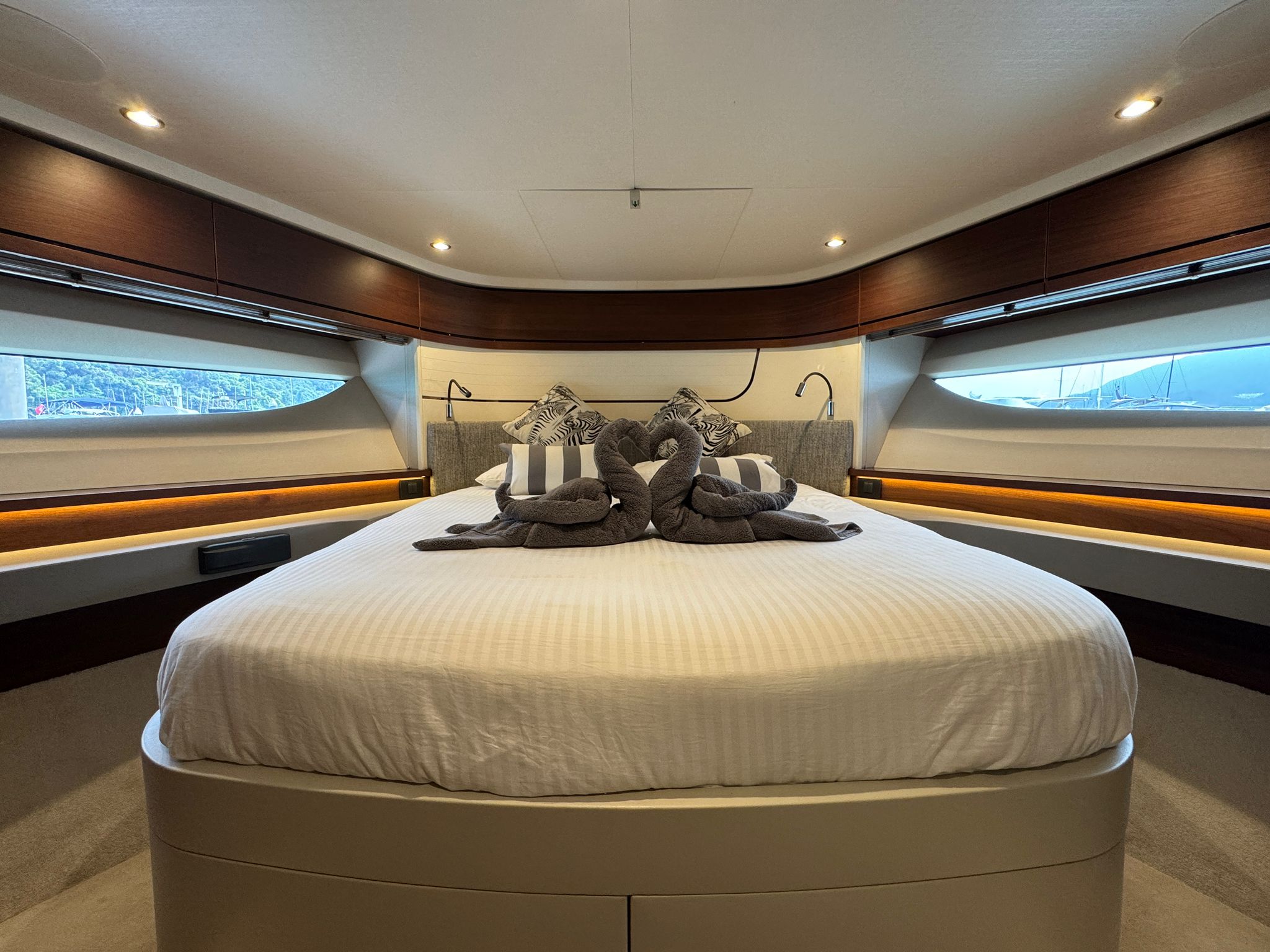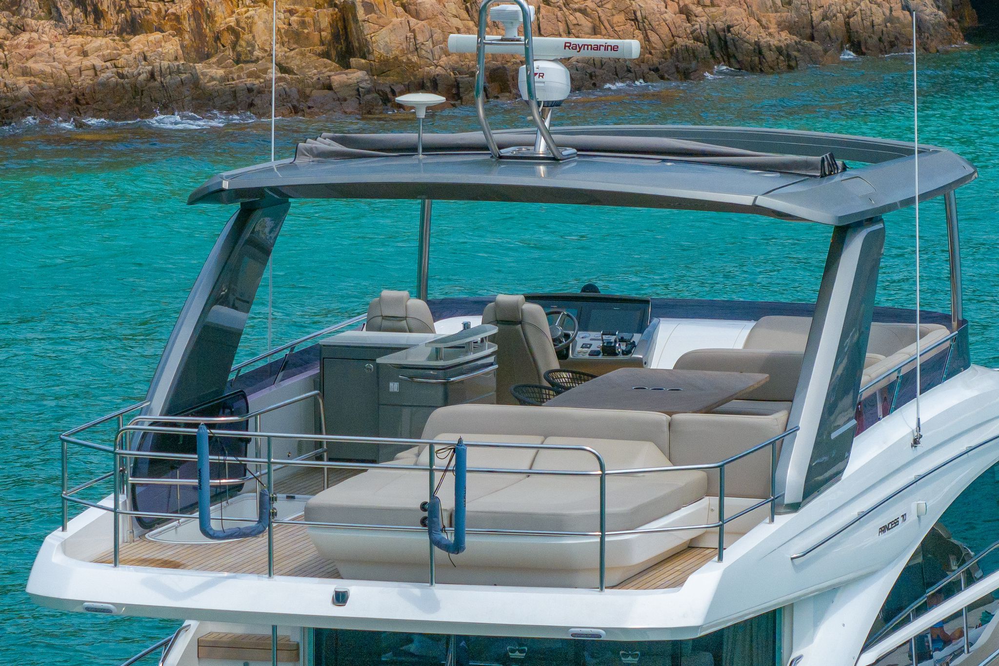 The Princess F70 features a spacious flybridge, a large U-shaped dining area, and a well-equipped wet bar. The main deck offers an aft galley arrangement that opens to the cockpit, and a walkthrough foredeck with additional seating and sunbathing areas. The yacht accommodates up to 8 guests overnight in 4 cabins, including a full-beam master stateroom, and can host up to 12 guests during the day.