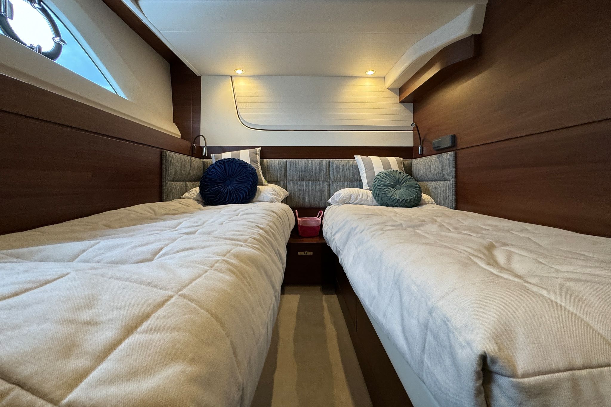 Inside, her appeal becomes all the more alluring. An aft-galley layout is perfectly placed to serve the cockpit, with triple sliding doors and an electrically opening aft window. Expansive areas of glass allow light to pour into the saloon, with the helm enjoying raised L-shaped seating to port for a more social journey. The master stateroom has a private stairwell and lobby, whilst guests enjoy a separate stairwell and three class-leading cabins.